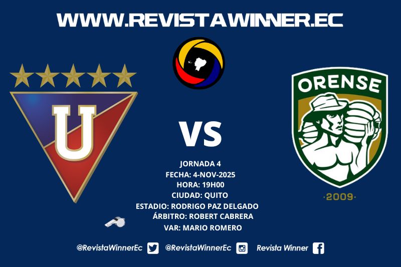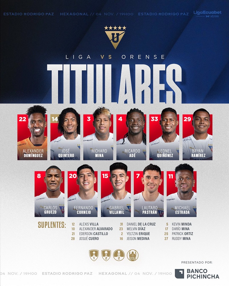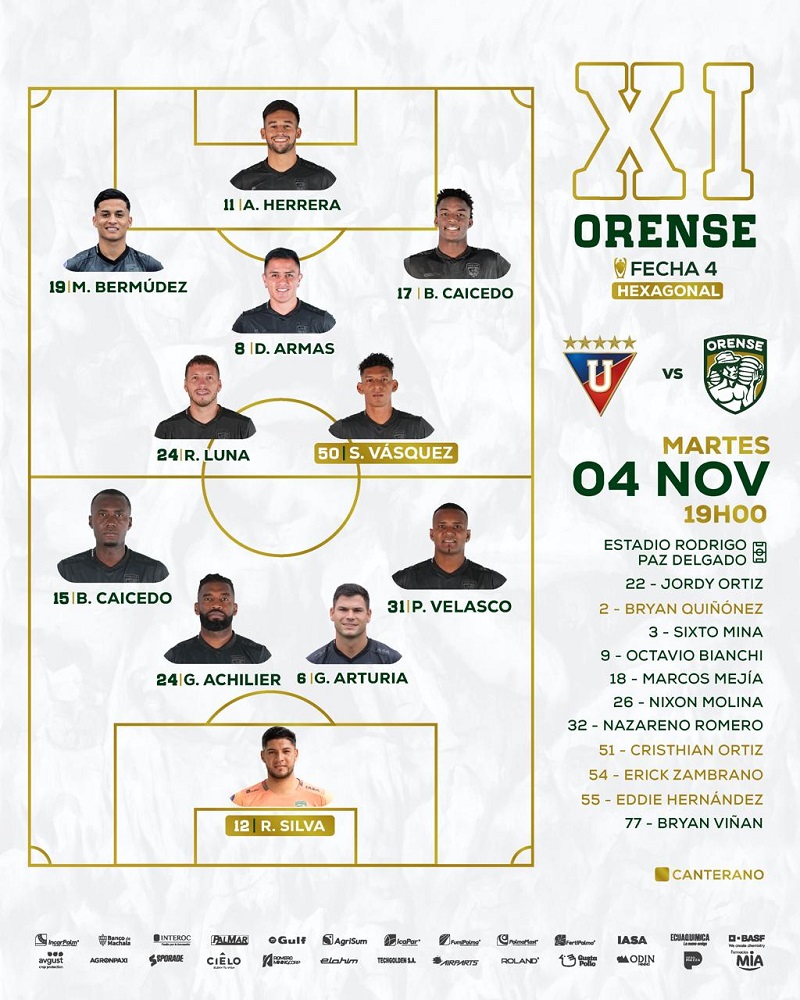 (Quito, noviembre 4).- Liga de Quito y Orense confirmaron sus alineaciones para lo que será el encuentro que jugarán desde las 19h00 en el estadio Rodrigo Paz Delgado, por la cuarta fecha del hexagonal final de LigaPro 2025.