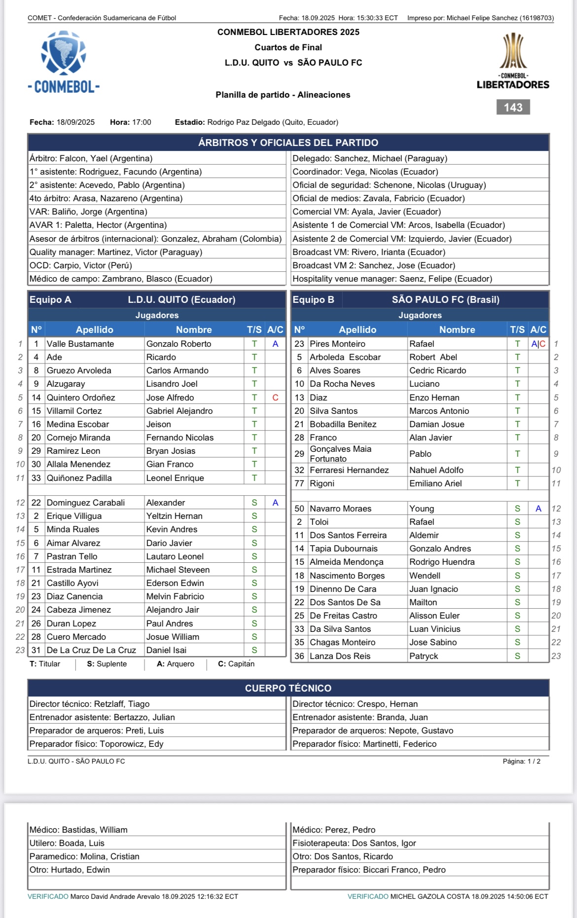 (Quito, septiembre 18).- Liga de Quito y Sao Paulo definieron las alineaciones para el partido de ida de los cuartos de final de la Copa Libertadores de América, en el estadio Rodrigo Paz Delgado de Quito.