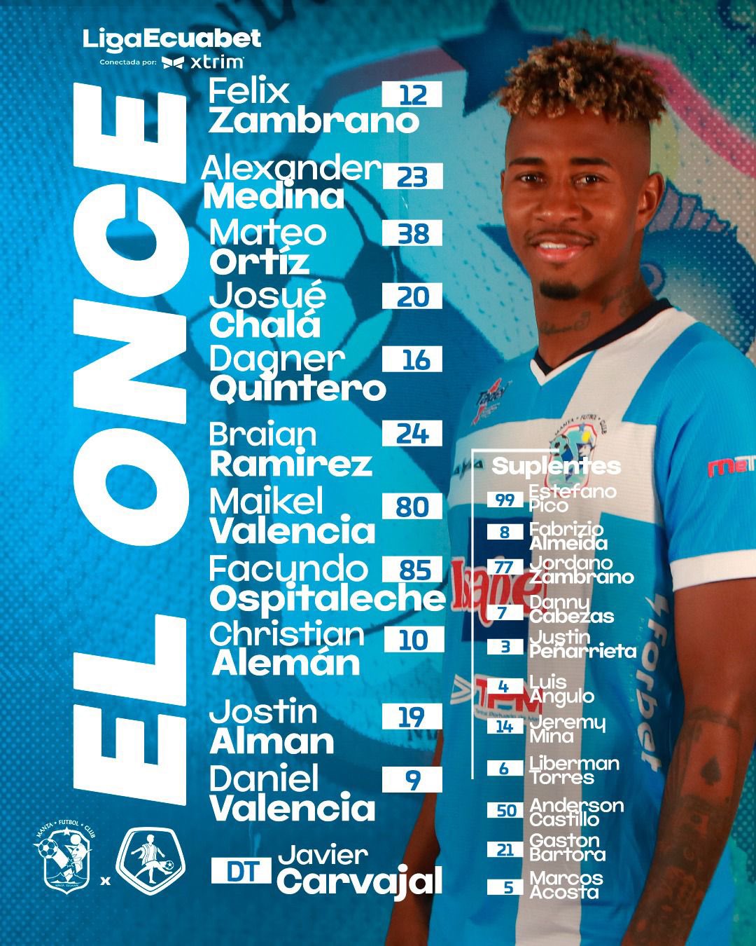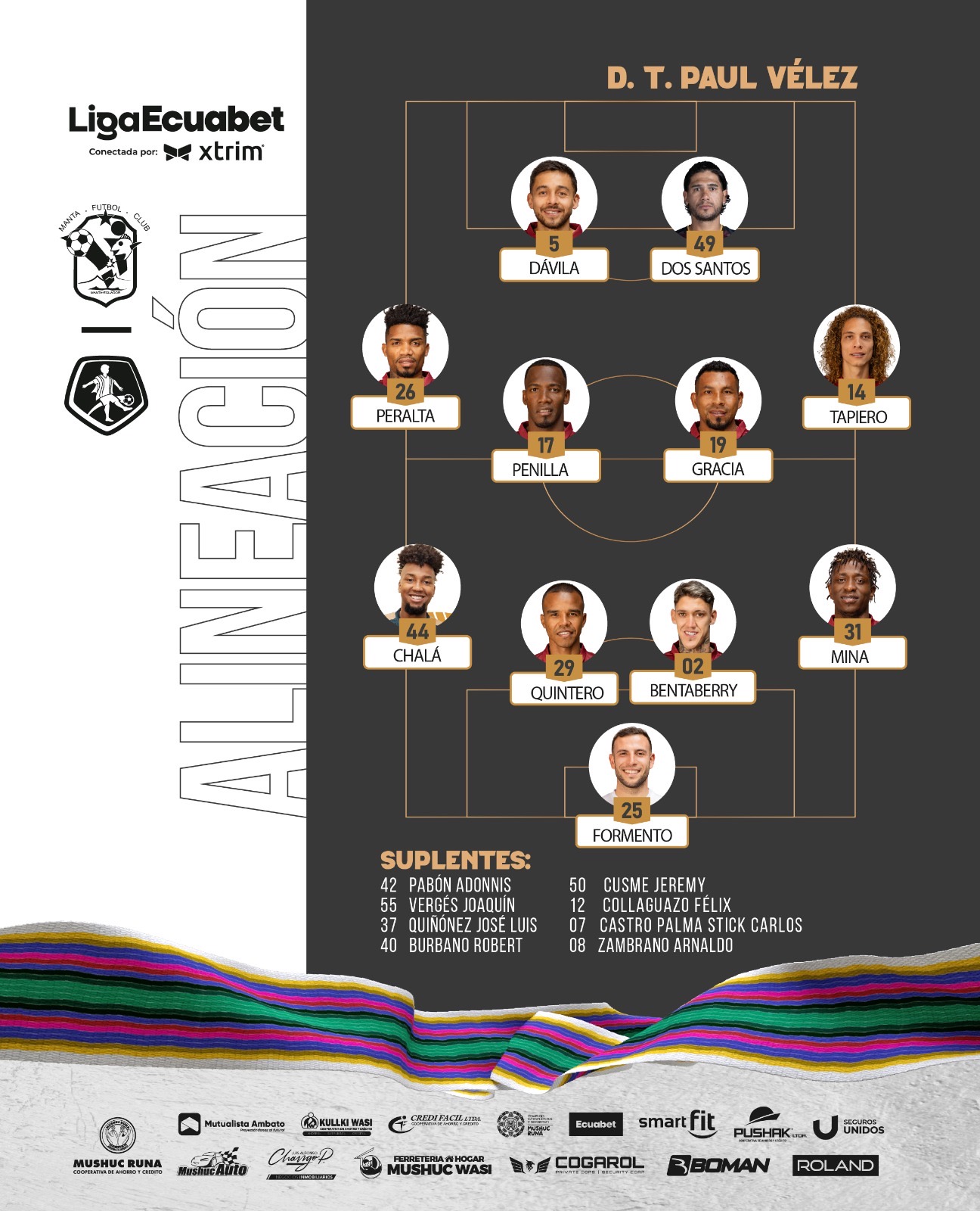 (Manta, noviembre 8).- Manta y Mushuc Runa confirmaron las alineaciones para lo que será el encuentro que jugarán desde las 14h00, por la cuarta fecha del cuadrangular del no descenso, en el estadio Jocay de la ciudad de Manta.