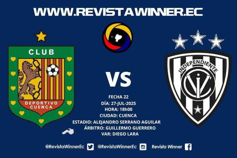 (Cuenca, julio 27) .- Club Deportivo Cuenca y Club Independiente del Valle, disputarán el penúltimo partido de la Fecha #22 de LigaPro 2025 en el estadio Alejandro Serrano Aguilar desde las 18:00.