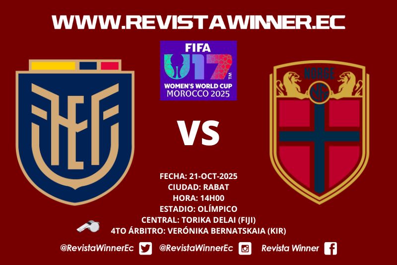 (Rabat, octubre 21).- La selección femenina sub-17 de Ecuador enfrenta hoy a la selección femenina sub-17 de Noruega en un duelo importante por la fecha 2 del Mundial Femenino Sub-17 de Marruecos 2025, en el Estadio «Academia de Fútbol Mohammed VI» a las 14:00 horas.